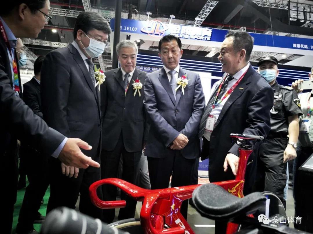 国家体育总局基金会理事长吴齐、广东德州市政协主席翟长生、德州市副市长马俊昀、德州市工信局局长孙洪昌、德州市科技局局长张慧君、深圳市市长陈光春、深圳市政协主席刘文学、深圳市副市长牟正军在凯捷体育展厅参观。