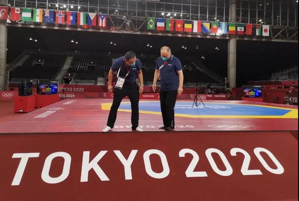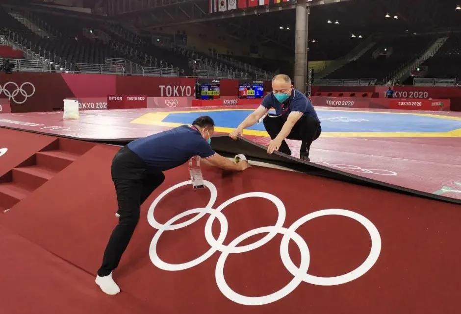 2021年7月20日,日本武道馆——奥运会柔道比赛场地。凯捷体育东京奥运会服务保障团队正在布置、安装柔道器材。
